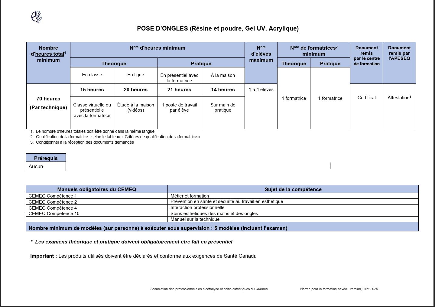 Vous pouvez consulter la liste et les exigences complètes directement sur le site officiel de l’APESEQ :